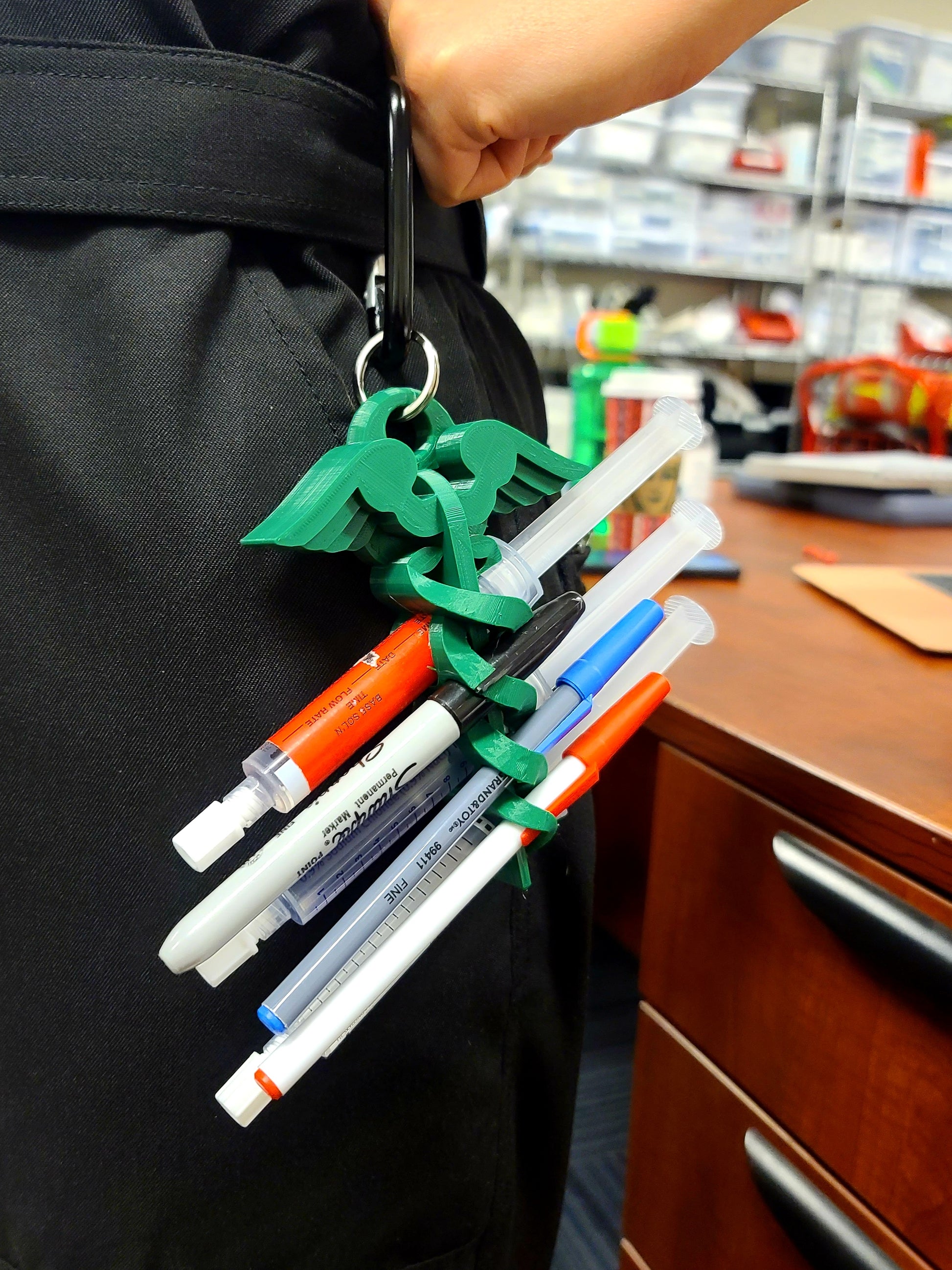Versatile and Practical Design The Caduceus Holder is ingeniously designed to attach anywhere a Carabiner can clip, offering unparalleled flexibility. Whether you're moving through the corridors of a hospital, aboard an aircraft, or at a patient's side, this holder ensures your syringes and pens are always within reach, securely organized alongside you.
