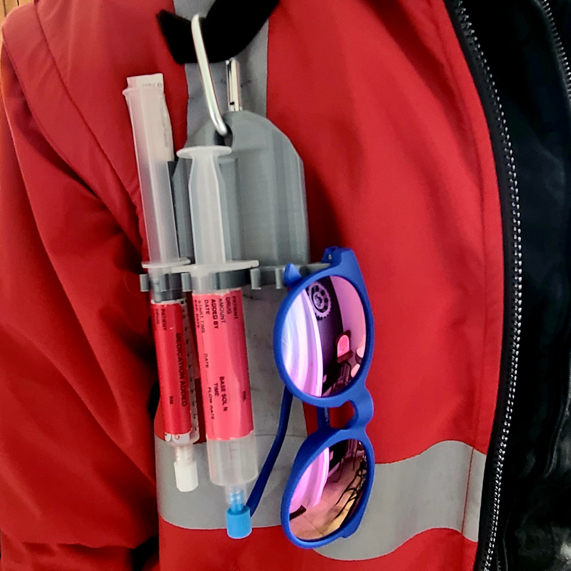 Versatile Mounting Options The Syringe Caddy's innovative design allows for mounting anywhere a Carabiner can clip, including IV poles, Pump Crowns, or even directly inside your aircraft. This flexibility means your syringes can be easily moved alongside your patient, ensuring critical medications are always within reach.