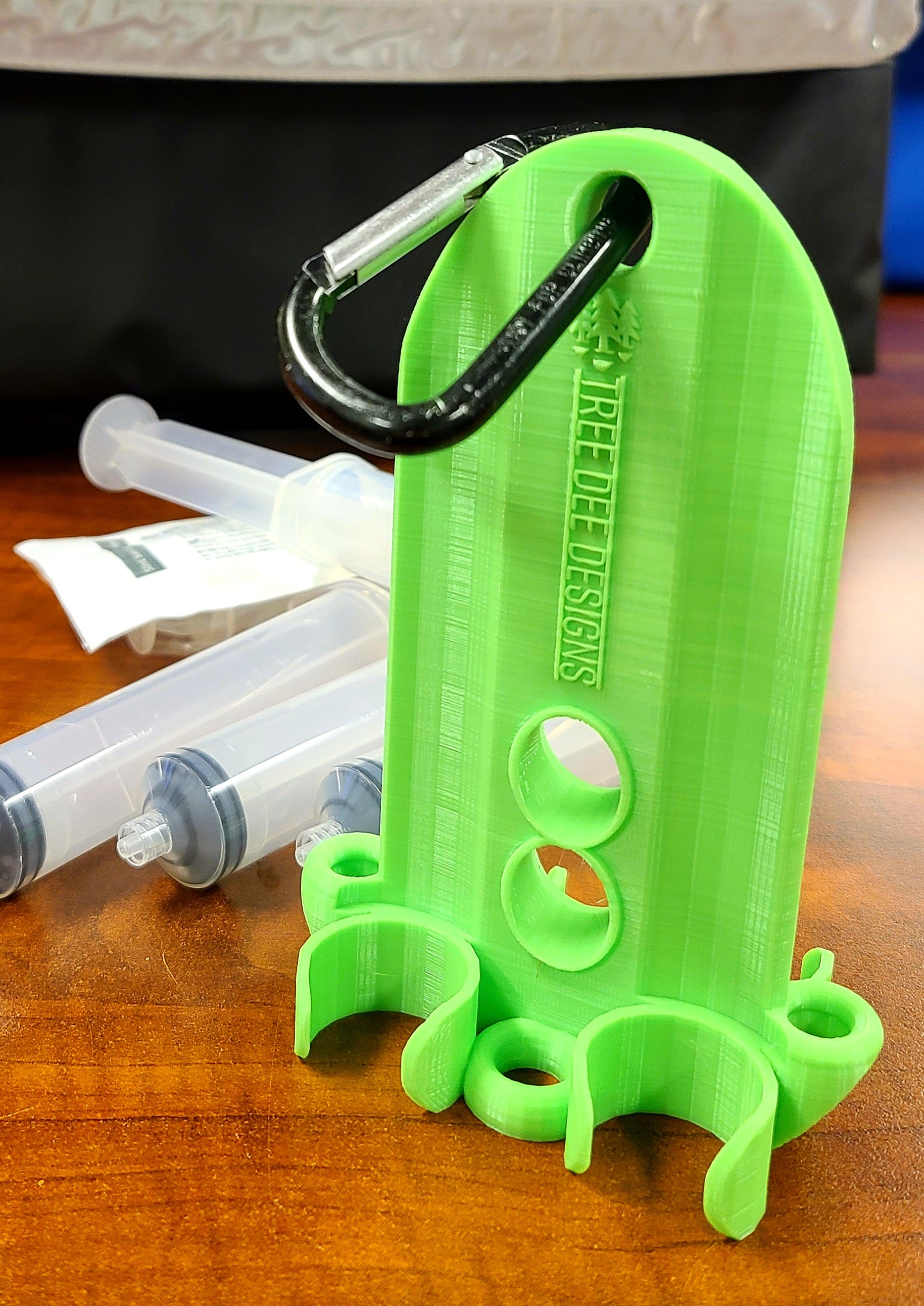 - The Syringe Fin holds 4x60cc syringes, 2x5cc syringe, 2x Carabiner mounts, and has a Carabiner mount on the top, allowing the Fin to be secured above an infusion pump on a IV pole.